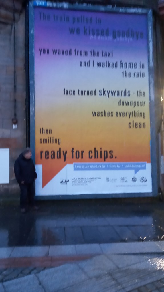 Posted on March 10, 2021 The Train pulled in My poem up outside Gilmour Street Station as part of TALK OF THE TOWN Share this: Click to share on X (Opens in new window) X Click to share on Facebook (Opens in new window) Facebook Like Loading... Related