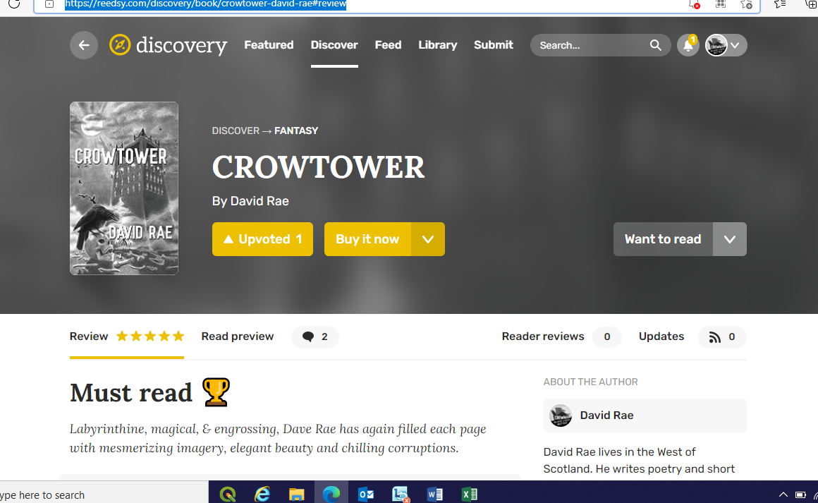 Posted on July 24, 2021 CROWTOWER 5 Star review Check out the 5 star review on Reedsy Discovery CROWTOWER by David Rae – Reviewed by Cynthia A. Morgan | Reedsy Discovery Share this: Click to share on X (Opens in new window) X Click to share on Facebook (Opens in new window) Facebook Like Loading... Related